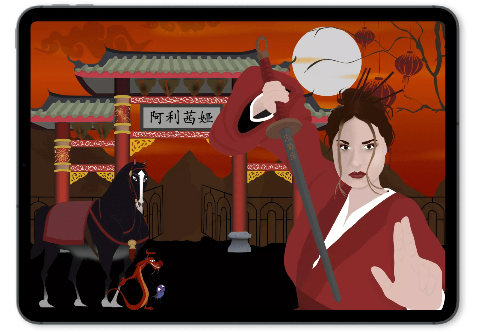 J'ai choisi l'univers de la geurrière Mulan pour ce projet. Ce choix Ce choix se justifie par mon admiration pour ce film et par ce que Mulan représente. Mulan, une femme parmi les hommes, qui se bat contre ses ennemis et la société tout en gardant ses valeurs et aspirations.